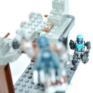 Establish your army, build and expand your units with the Halo ODST Ambush playset by Mega Bloks! Inside a ruined UNSC recruitment center, an ODST Urban Specialist has spotted a Jump Pack Brute on patrol. Using his new SMG with silencer, the ODST sets up a second floor ambush on the Brute before it can identify and eliminate the trooper.